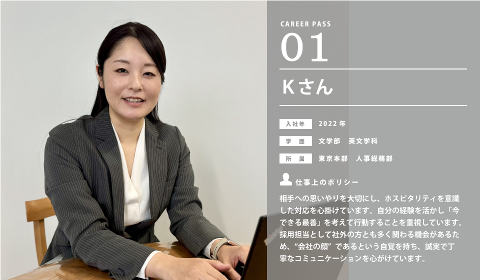 - 学生や応募者と向き合い、誠実なコミュニケーションで会社の魅力を伝えられる。自分が採用に関わった人材が入社後に活躍し、組織の力になっていく姿を見ることは、私にとって大きなやりがいです。